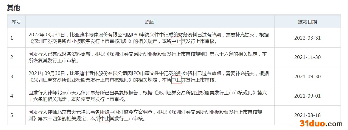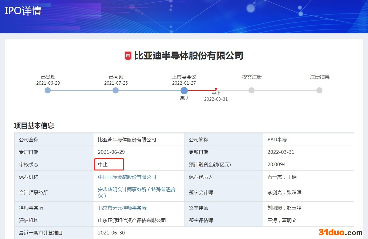 中新经纬3月31日电 据深交所网站31日消息,因财务资料已过有效期,深交所再次中止了比亚迪半导体创业板IPO审核。
