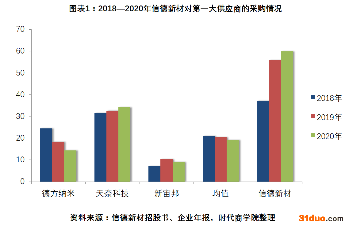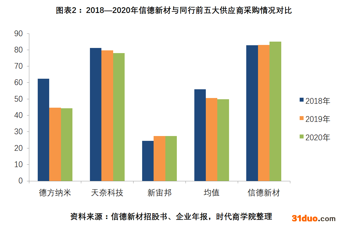 据招股书,2018—2020年,信德新材对前五大供应商的采购比例分别为82.84%、82.98%、85.02%;同行如天奈科技对前五大供应商的采购比例分别为81.19%、79.72%、78.02%;德方纳米对前五大供应商的采购比例分别为62.35%、44.66%、44.23%;新宙邦对前五大供应商的采购比例分别为24.4%、27.39%、27.38%。
