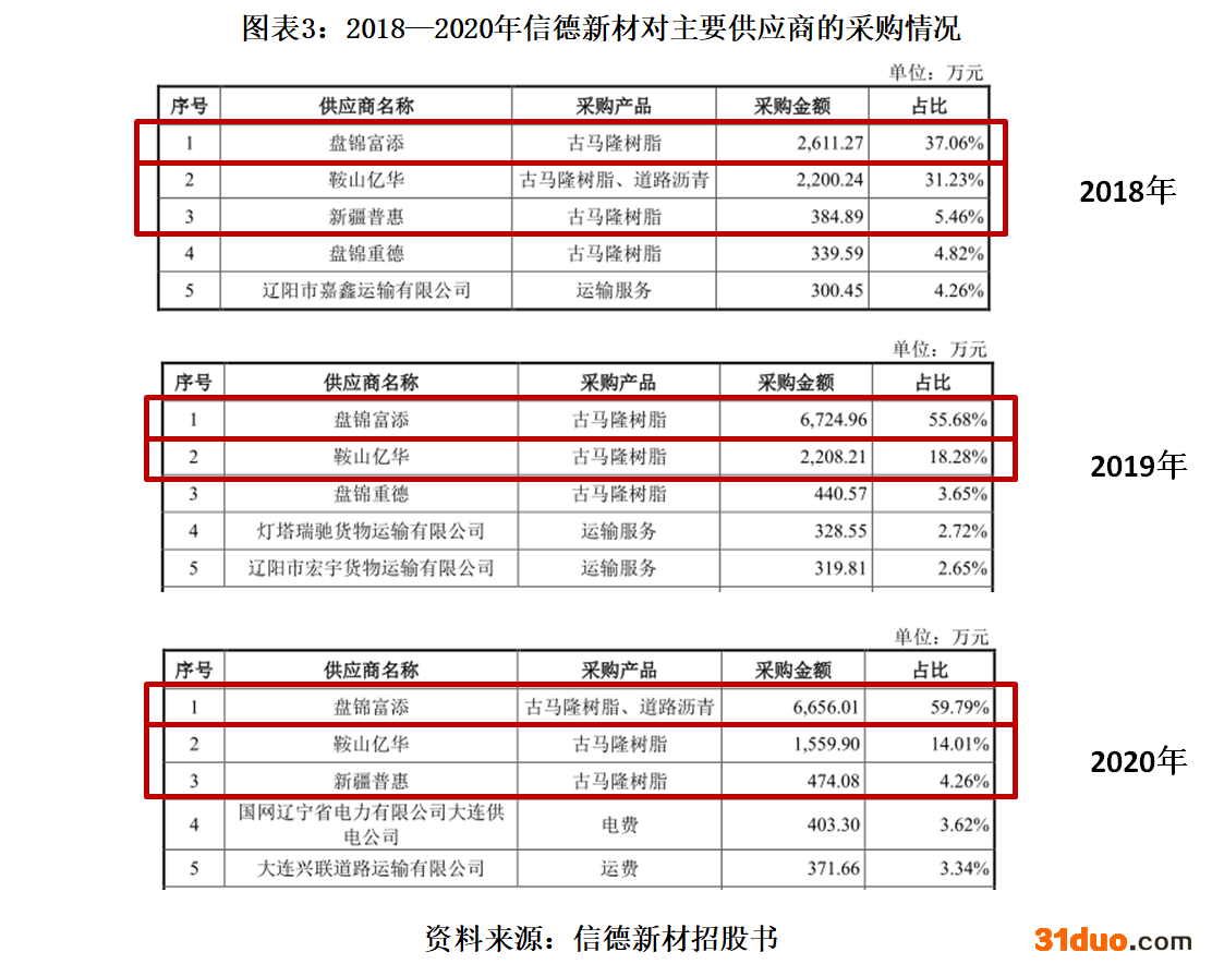 据招股书,2018—2021年上半年(以下简称“报告期内”),信德新材对第一大供应商盘锦富添的采购金额分别为2611.27万元、6724.96万元、6656.01万元、5369.87万元,占各期采购金额的比重分别为37.06%、55.68%、59.79%、43.66%,占比较高。
