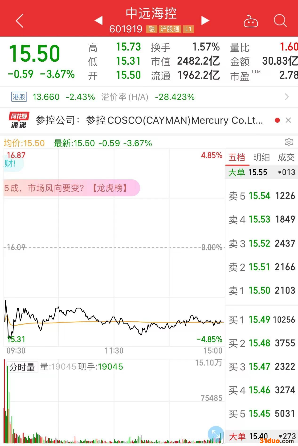 3月31日,中远海控低开低走,截至收盘报15.50元,下跌3.67%。