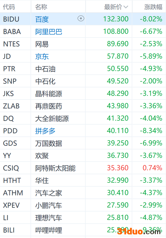 截止美股收盘,纳斯达克金龙指数大幅下挫5.44%,其中百度(BIDU.US)、阿里巴巴(BABA.US)分别下跌8.02%和6.67%。