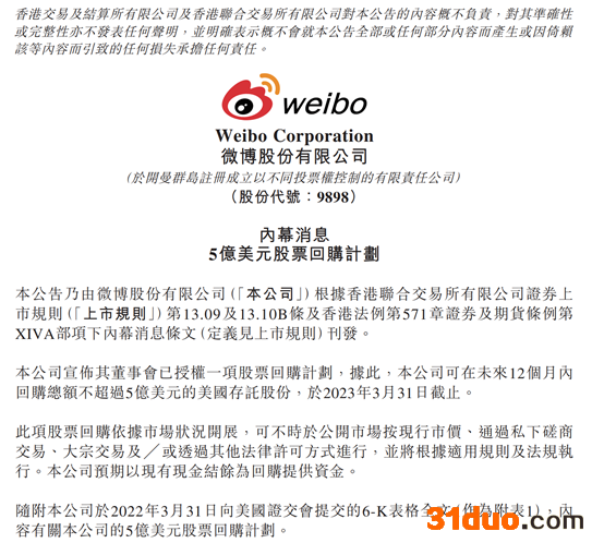 根据微博公告,董事会已授权一项股票回购计划,其中公司可在未来12个月内回购至多5亿美元的美国存托股份,回购期至2023年3月31日。