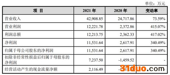 2021年,长光华芯实现营业收入42,908.85万元,同比增长73.59%;归属于母公司股东的净利润11,531.64万元,同比增长340.49%;扣除非经常性损益后归属于母股东的净利润7237.50万元;经营活动产生的现金流量净额2116.49万元。