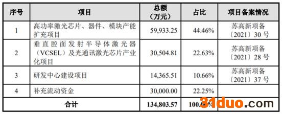 公司实际募资净额较原拟募资多11.88亿元。长光华芯2022年3月29日披露的招股书显示,公司拟募集资金13.48亿元,分别用于“高功率激光芯片、器件、模块产能扩充项目”、“垂直腔面发射半导体激光器(VCSEL)及光通信激光芯片产业化项目”、“研发中心建设项目”、“补充流动资金”。