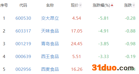 交大昂立、天味食品、青岛食品、西王食品、西麦食品位列板块涨幅榜后五位,涨幅分别为-5.81%、-4.91%、-3.85%、-3.33%、-2.63%。