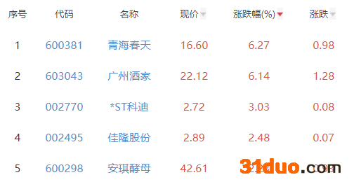 其中,青海春天、广州酒家、*ST科迪、佳隆股份、安琪酵母位列板块涨幅榜前五位,涨幅分别为6.27%、6.14%、3.03%、2.48%、2.23%。