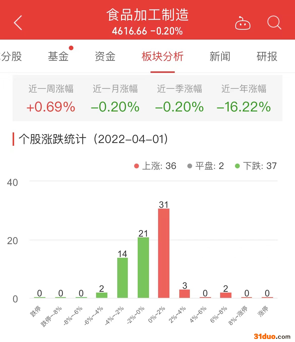 中国经济网北京4月1日讯 今日,食品加工制造板块整体跌幅0.20%,其中36只股票上涨,2只股票平盘,37只股票下跌。