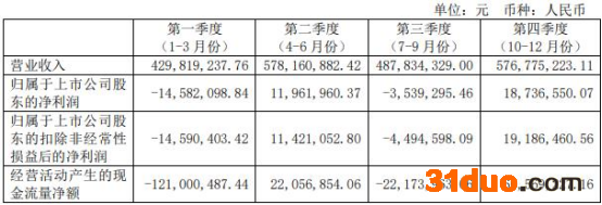 公司第四季度(10-12月份)营业收入实现5.77亿元,归属于上市公司股东的净利润1873.66万元,归属于上市公司股东的扣除非经常性损益的净利润1918.65万元,经营活动产生的现金流量净额6056.92万元。