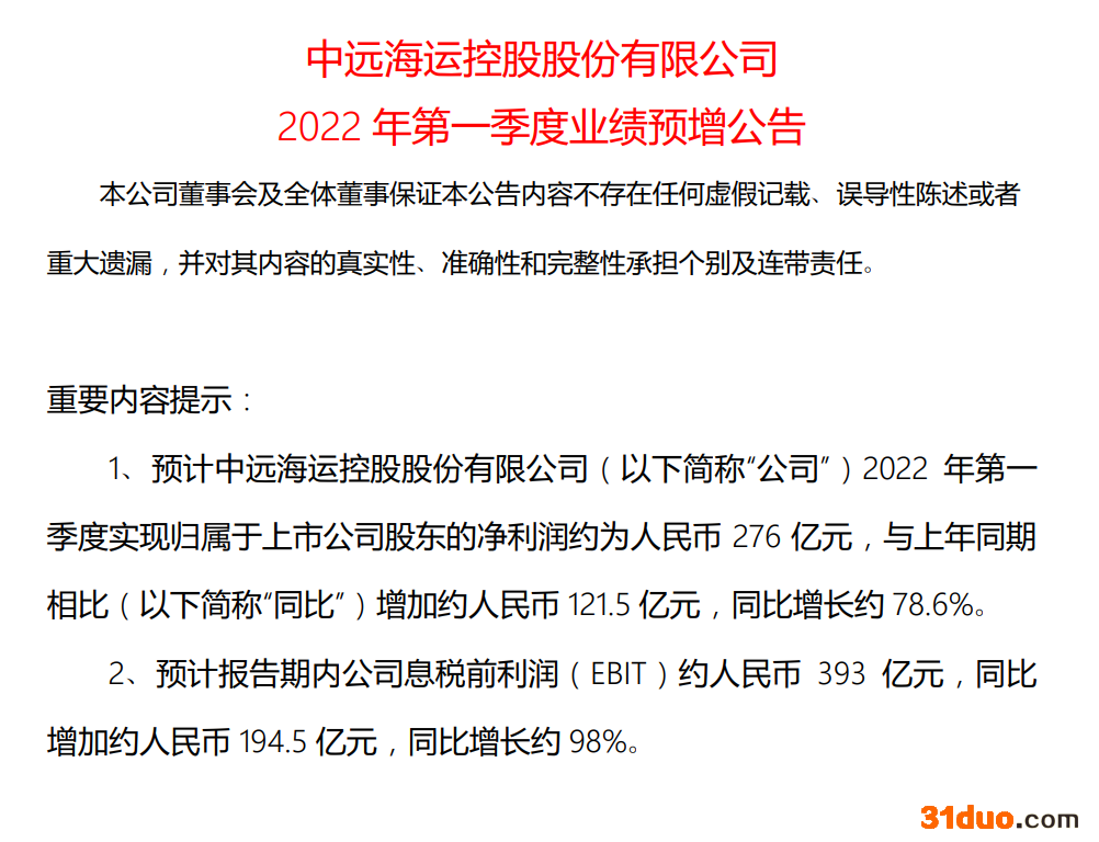 根据中远海控在周四晚间发布公告称,该公司在2022年第一季度实现归属于上市公司股东的净利润约为人民币276亿元,较去年同期相比增加约人民币121.5亿元,同比增长约78.6%;息税前利润(EBIT)约人民币393亿元,同比增加约人民币194.5亿元,同比增长约98%。