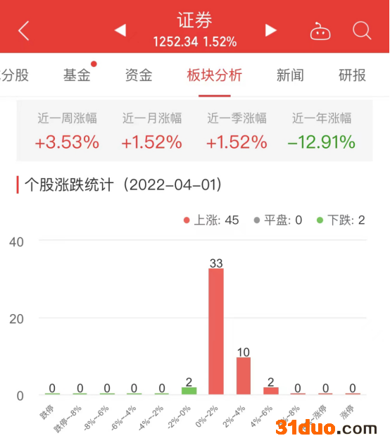 中国经济网北京4月1日讯 今日,证券板块整体涨幅1.52%,其中45只股票上涨,0只股票平盘,2只股票下跌。