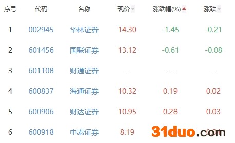 华林证券、国联证券、海通证券、财达证券、中泰证券位列涨幅榜后五位,涨幅分别为-1.45%、-0.61%、0.19%、0.28%、0.49%。