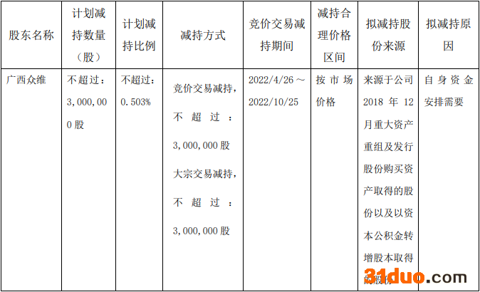 截至公告披露日,广西众维持有公司股份796.84万股,占公司总股本的1.34%。上述股份来源于公司2018年12月重大资产重组及发行股份购买资产取得的股份以及以资本公积金转增股本取得的股份,已于2022年1月21日解除限售并上市流通。