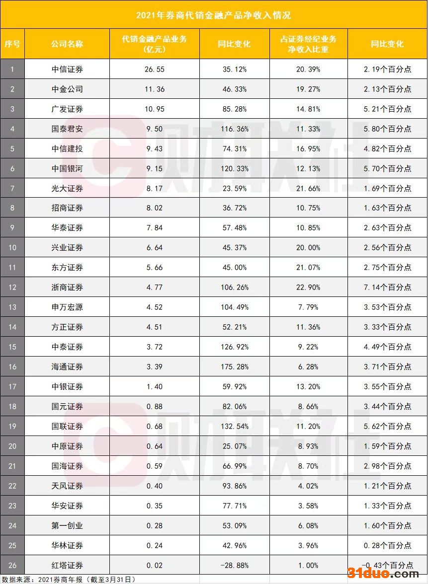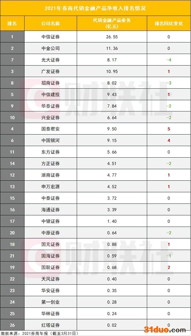 截至3月31日,已披露2021年报的上市券商中,有3家券商代销金融产品净收入超过10亿元,由高到低依次为中信证券(26.55亿元)、中金公司(11.36亿元)、广发证券(10.95亿元)。去年同期则仅中信证券一家以19.65亿元的代销净收入站上十亿元台阶。