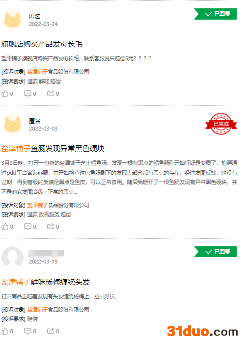 此外,黑猫投诉平台上,与盐津铺子相关的投诉已有百余条,涉及盐津铺子旗下多款食品。