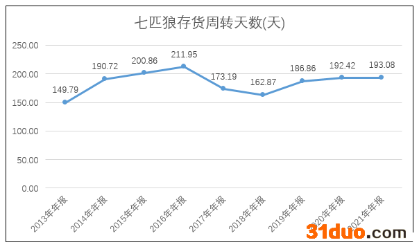 2013年至2017年,七匹狼的库存量由746万件增长至3513万件,库存周转天数也由2013年的149天增至2016年的211天;此后库存量和周转天数均有所降低。