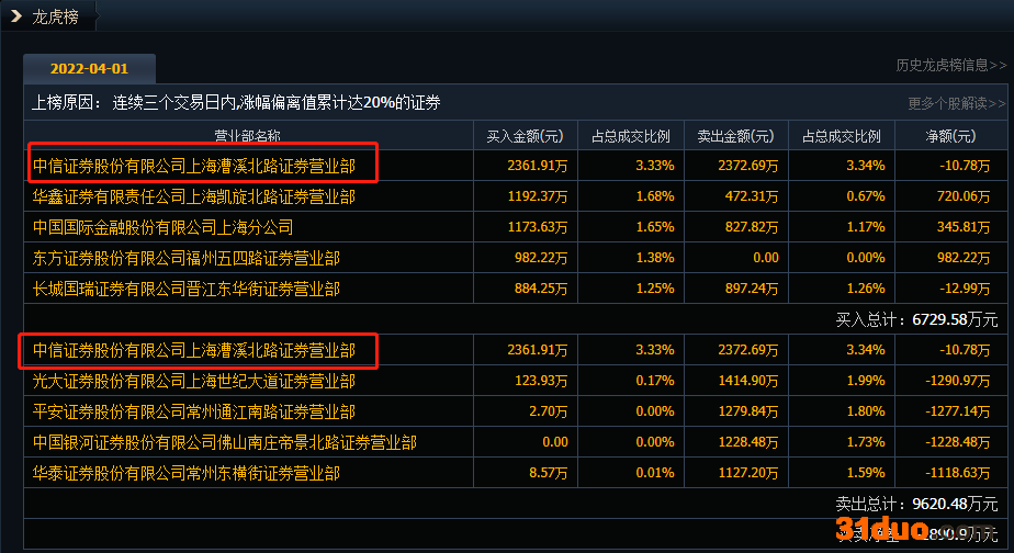 中科云网4月1日龙虎榜,来源:同花顺iFinD