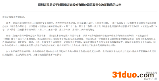 4月2日,深圳证监局公布了招商证券“3·14网络安全事件”的处罚决定。深圳证监局表示,招商证券在2022年3月14日的网络安全事件中,存在变更管理不完善,应急处置不及时、不到位等问题,违反《信息安全保障管理办法》以及《信息技术管理办法》相关规定。深圳证监局决定,对招商证券采取责令改正的行政监管措施。