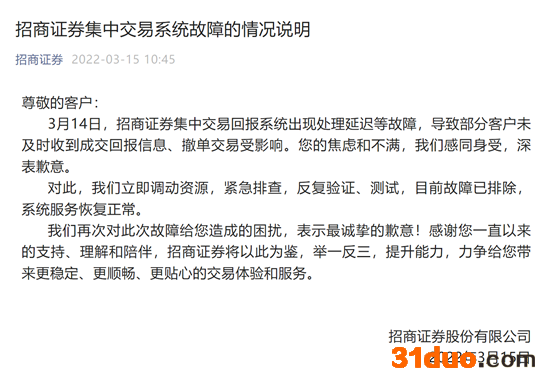 次日上午,招商证券再次针对该系统故障事件作出情况说明。招商证券表示,3月14日,公司集中交易回报系统出现处理延迟等故障,导致部分客户未及时收到成交回报信息、撤单交易受影响,“您的焦虑和不满,我们感同身受,深表歉意。”
