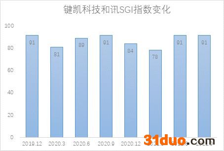 从最新的和讯SGI评分可以看出,排除季节影响因素,键凯科技基本维持在90分上下的高分值,公司成长性稳定强劲。