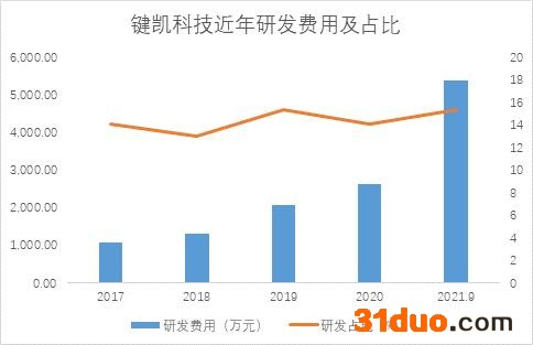 2021年键凯科技仍然将增强研发实力作为全年工作的主要方向之一。累计研发投入5,396.86 万元,比上年增长 105.22%,研发投入占营业收入的比重达到 15.37%。