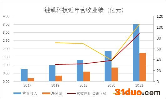 2017-2021年,键凯科技的营业收入从0.77亿元增长至 3.51亿元,净利润由 2117万元增长至1.76亿元,除2020年受疫情影响增速下降,营收与利润始终保持稳定增长。