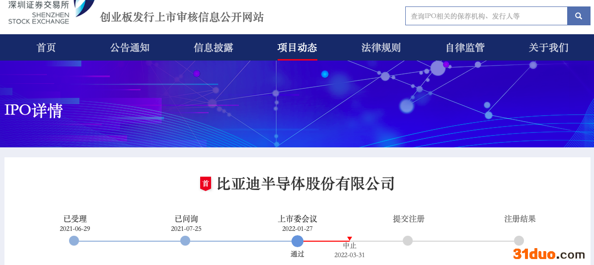 3月31日,深圳证券交易所创业板发行上市审核信息公开网站显示,比亚迪半导体股份有限公司(以下简称比亚迪半导体)IPO审核状态显示为“中止”,原因是比亚迪半导体IPO申请文件中记载的财务资料已过有效期,需要补充提交,根据《深圳证券交易所创业板股票发行上市审核规则》的相关规定,深交所中止其发行上市审核。