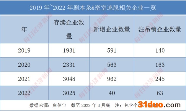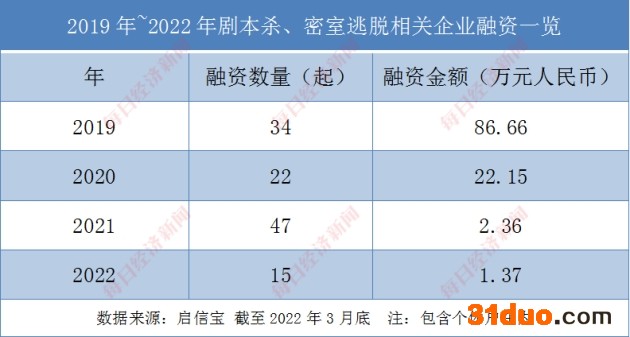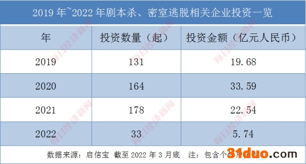 启信宝数据显示,2019年,剧本杀 密室逃脱相关企业共发生131起投资,投资总金额近20亿元;到了2020年、2021年,投资数量分别增长至164起、177起,投资总额分别为33.57亿元、22.52亿元。而今年前3个月,投资数量仅为33起,投资总额为5.74亿元。
