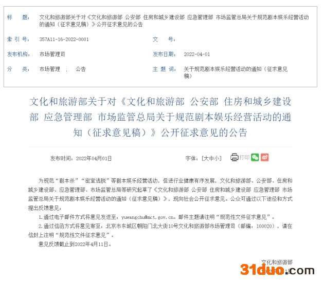 4月1日,文化和旅游部发布首个国家范围内的剧本杀、密室逃脱管理规范,并公开征求意见。“规范”明确要求对剧本脚本设置适龄提示,不得在国家法定节假日、休息日及寒暑假期外向未成年人提供剧本娱乐经营活动等。
