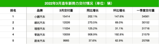 具体而言,位居第一的小鹏汽车3月交付量为1.54万辆,环比增长148%,同比增长202%。小鹏汽车方面表示,尽管面临疫情及供应链的挑战,但第一季度小鹏汽车累计交付量仍然达到3.46万辆,为去年同期的2.6倍,再次超过财报指引上限。