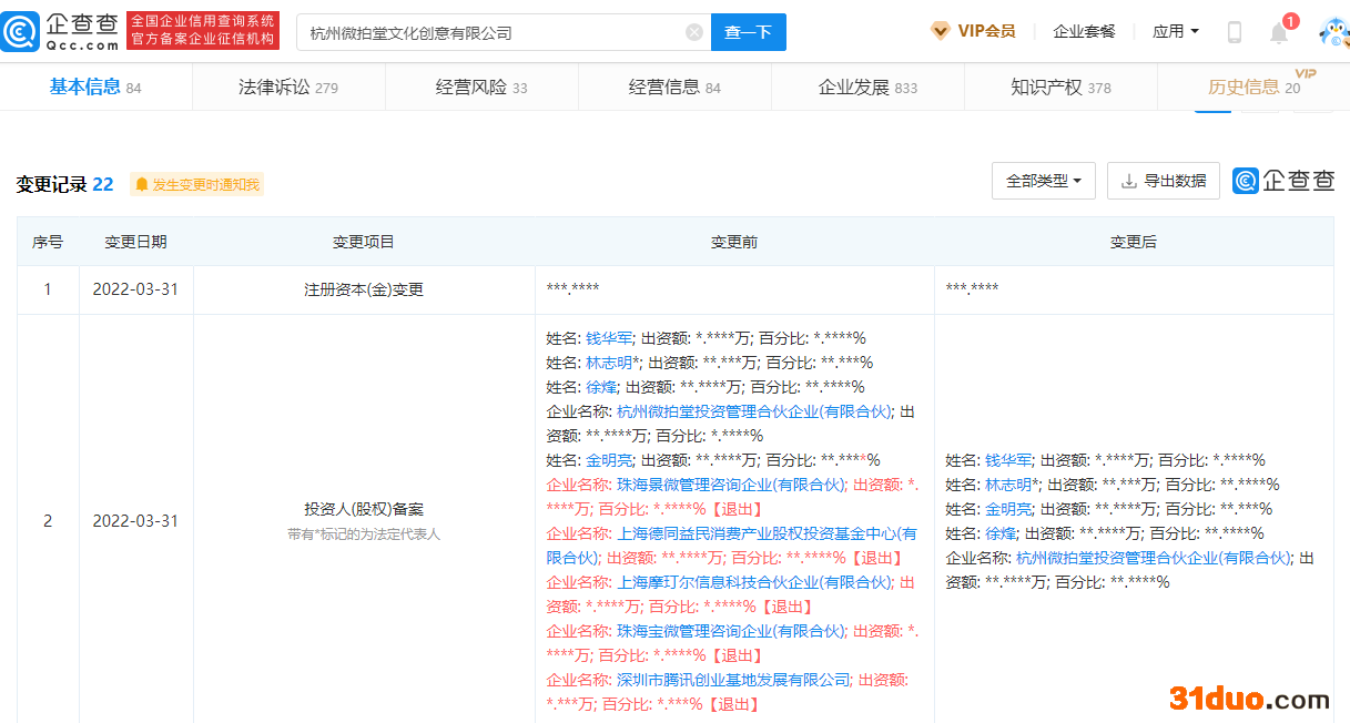 中国网科技4月7日讯(记者 柏林)企查查App显示,3月31日,杭州微拍堂文化创意有限公司发生工商变更,原股东深圳市腾讯创业基地发展有限公司等退出。