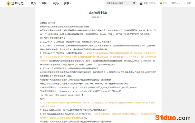 蓝鲸TMT频道4月7日讯,企鹅电竞发布退市公告称,由于业务发展策略的变更,企鹅电竞相关产品,包括《企鹅电竞》(包括其网页端、App端、PC端、TV端、H5、微信小程序)以及《企鹅电竞直播助手》(包括其网页端、App端、PC端),将于2022年6月7日23时59分终止运营。