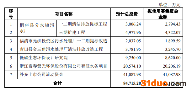 同时,菲达环保还拟募集配套资金不超过8.21亿元,拟用于投入桐庐县分水镇污水厂一二期清洁排放提标工程项目、桐庐县分水镇污水厂三期扩建工程项目等多个项目。