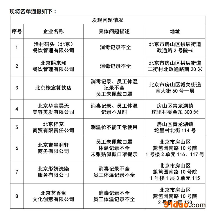 据北京市房山区市场监督管理局微信号消息,房山区市场防疫工作组4月7日通报,检查中发现8家市场主体存在疫情防控措施落实不到位的问题,主要包括:未建立员工体温记录台账(未及时记录)、未建立场所消杀记录台账(未及时记录)、员工未佩戴口罩、场所内无一米线、未对消费者体温检测、未查验消费者健康宝等问题。