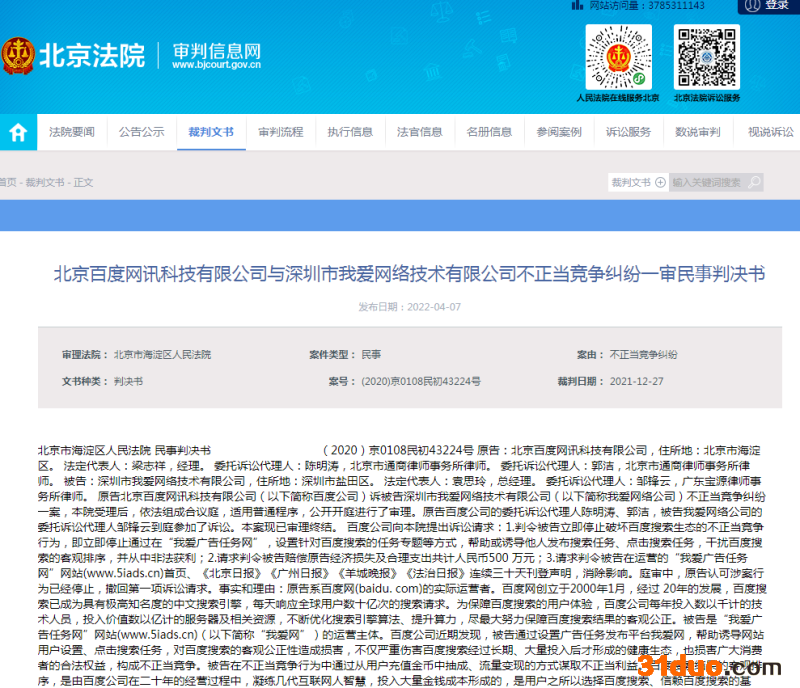 蓝鲸TMT频道4月7日讯,据北京法院审判信息网,北京百度网讯科技有限公司与深圳市我爱网络技术有限公司相关不正当竞争纠纷一审法律文书近日公布。文书显示,百度公司称,被告通过我爱网平台,帮助或诱导用户制造虚假点击数据,扰乱原有客观排序结果,通过虚假点击提高搜索排名,构成不正当竞争,请求法院判令被告赔偿经济损失500万元。