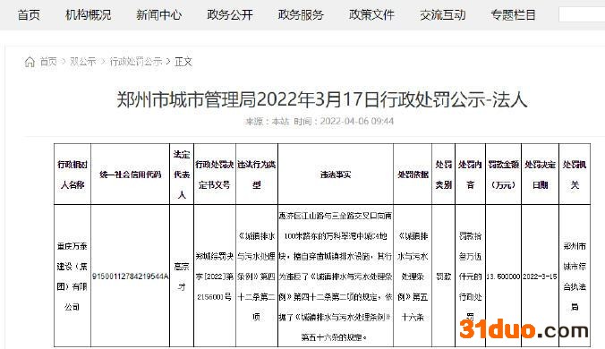 中国网财经4月7日讯 (记者 曹中原) 日前,郑州市城市管理局发布处罚信息,重庆万泰建设(集团)有限公司因擅自穿凿城镇排水设施,被郑州市城市综合执法局罚款13.5万元。