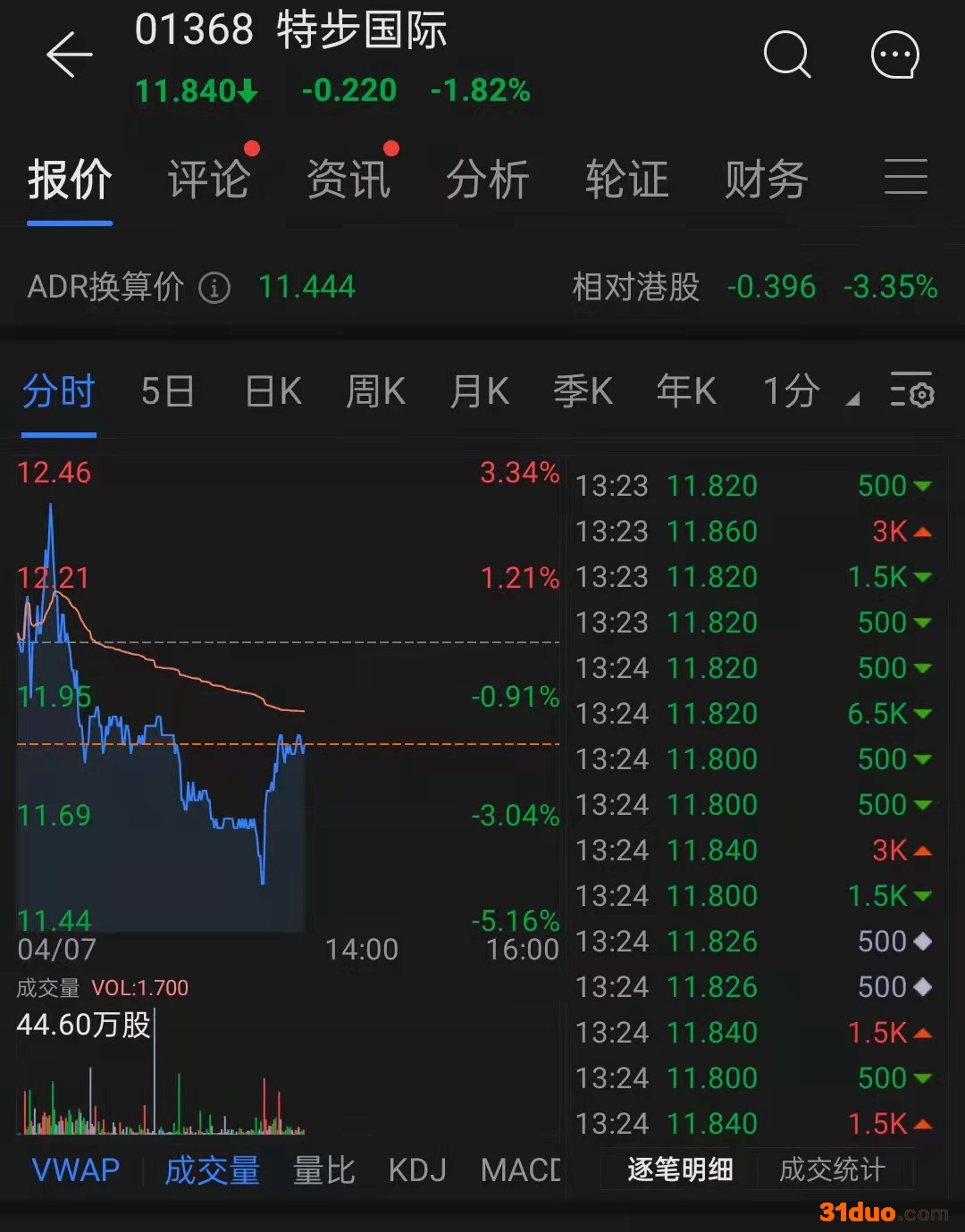 午盘开始后,特步跌幅开始收敛,发稿时股价从当天最大跌幅4.31%小幅回弹至跌1.99%,报11.82港元。