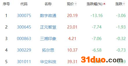 数字政通、正元智慧、三湘印象、拓尔思、华立科技位列涨幅榜后五位,涨幅分别为-13.16%、-7.74%、-7.06%、-6.58%、-6.41%。