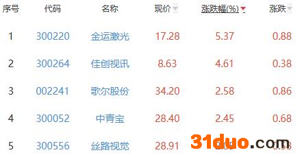 其中,金运激光、佳创视讯、歌尔股份、中青宝、丝路视觉位列板块涨幅前五位,涨幅分别为5.37%、4.61%、2.58%、2.45%、2.05%。