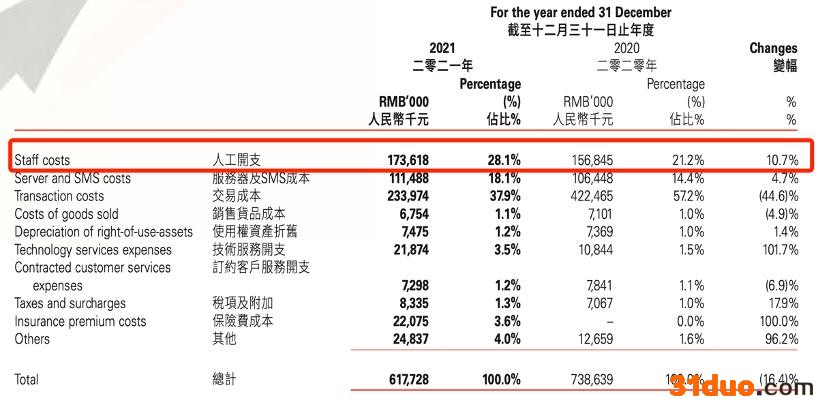 中国有赞“无情”背后,是持续攀升的成本压力。历年财报显示,2018年至2021年,中国有赞员工人数分别为2206人、2941人、3603人、4494人。员工逐年增多,中国有赞的成本也在不断增加。2021年报显示,中国有赞的人工开支达到1.74亿元,同比增长10.7%,占总开支比例从2020年21.2%上升为28.1%。