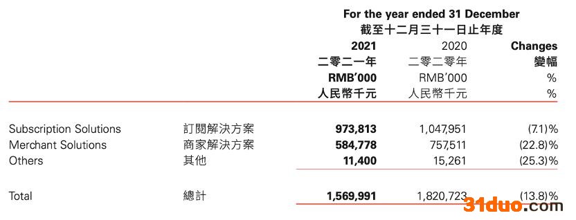 虽有节流,但开源却很难。中国有赞日前公布的2021年报显示,公司全年实现营业收入15.7亿元人民币,同比下降13.8%;净利润亏损32.93亿元,同比扩大503.5%。分业务看,订阅解决方案实现营业收入9.74亿元,同比下降7.1%;商家解决方案实现营业收入5.85亿元,同比下降22.8%;其他业务收入约为1140万元,同比下降25.3%。