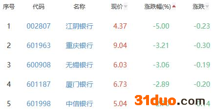 江阴银行、重庆银行、无锡银行、厦门银行、中信银行位列涨幅榜后五位,涨幅分别为-5.00%、-3.21%、-3.06%、-2.89%、-2.70%。
