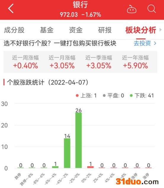 中国经济网北京4月7日讯 今日,银行板块整体跌幅1.67%,其中1只股票上涨,0只股票平盘,41只股票下跌。
