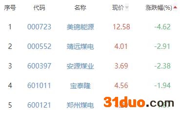 美锦能源、靖远煤电、安源煤业、宝泰隆、郑州煤电位列涨幅榜后五位,涨幅分别为-4.62%、-2.91%、-2.38%、-1.94%、-1.87%。