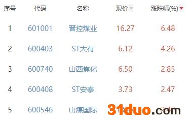 其中,晋控煤业、ST大有、山西焦化、ST安泰、山煤国际位列板块涨幅前五位,涨幅分别为6.48%、4.26%、2.85%、2.47%、2.47%。