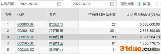 事实上,据Wind统计数据,2021年4月2日至2022年4月2日,上市公司中持有理财产品个数前三的是江苏国泰(002091.SZ)、顺博合金(002996.SZ)和爱婴室(603214.SH),分别为261个、212个、161个;按认购金额,排在前三的上市公司是航发动力、江苏国泰(002091.SZ)、欧普照明(603515.SH),认购金额合计为308亿元、285.84亿元、202.73亿元。即便工业富联仅实施一半的现金管理额度,或也冲击“前三”榜单。