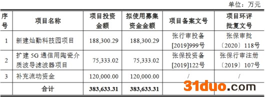 灿勤科技本次发行募集资金总额为10.50亿元,扣除发行费用后募集资金净额为9.74亿元。该公司最终募集资金净额比原计划少28.62亿元。灿勤科技2021年11月11日披露的招股说明书显示,其拟募集资金38.36亿元,拟分别用于新建灿勤科技园项目、扩建5G通信用陶瓷介质波导滤波器项目、补充流动资金。