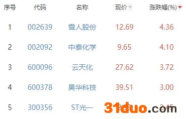 其中,雪人股份、中泰化学、云天化、昊华科技、ST光一位列板块涨幅前五位,涨幅分别为4.36%、4.10%、3.72%、3.00%、2.45%。