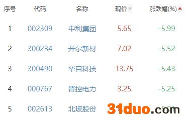 中利集团、开尔新材、华自科技、晋控电力、北玻股份位列涨幅榜后五位,涨幅分别为-5.99%、-5.52%、-5.43%、-5.25%、-5.01%。