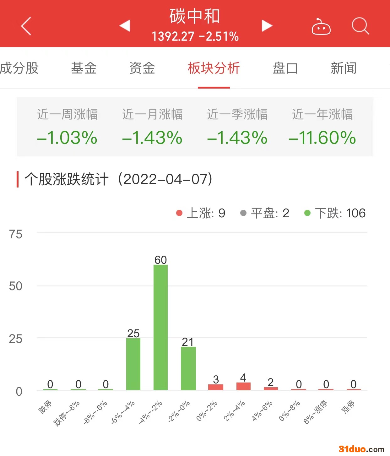 中国经济网北京4月7日讯 今日,碳中和板块整体跌幅2.51%,其中9只股票上涨,2只股票平盘,106只股票下跌。