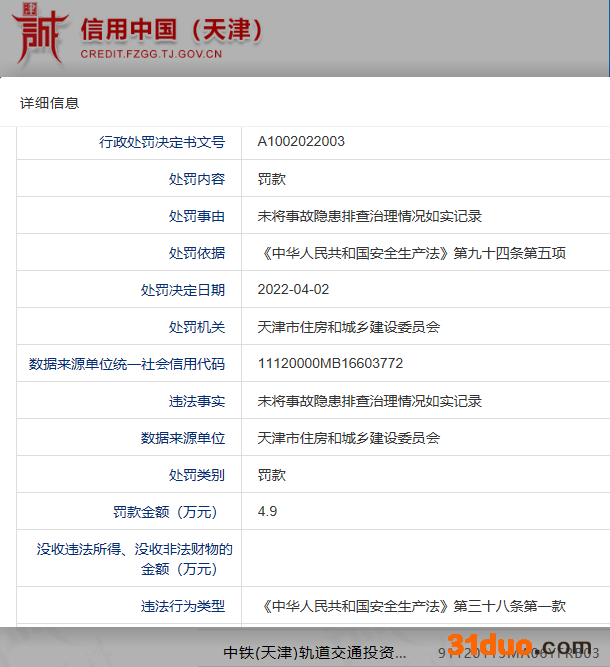 中国网财经4月7日讯(记者 钟文鑫)据信用中国(天津)网站消息,4月2日,中铁(天津)轨道交通投资建设有限公司因未将事故隐患排查治理情况如实记录,违反了《中华人民共和国安全生产法》相关规定,被天津市住房和城乡建设委员会罚款4.9万元。